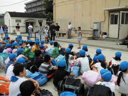 7時40分みさきの家にむけての出発式。4年生全員元気に出発しました。バスと船を乗り継ぎ,予定通り,12時,三重県志摩にあるみさきの家に誰ひとり体調をくずすことなく到着しました。入所式・昼食を終え,オリエンテーションを受けているところです。こちらは,薄曇りでむし暑い天候です。さあ,野外活動が始まりました。