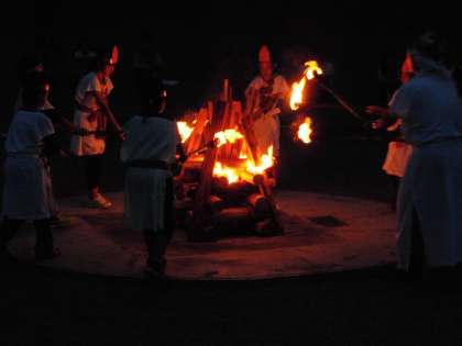 お風呂・夕食が終わってころには日が暮れ,子どもたちが楽しみにしていたキャンプファイヤーが,始まりました。火の神と火の子たちの登場から始まり,レクリエーション係の子たちが進行する中,ゲーム・歌・ダンスと大いに楽しみました。その後,大広間とバンガローに分かれて,就寝しました。元気に一日目を終えました。