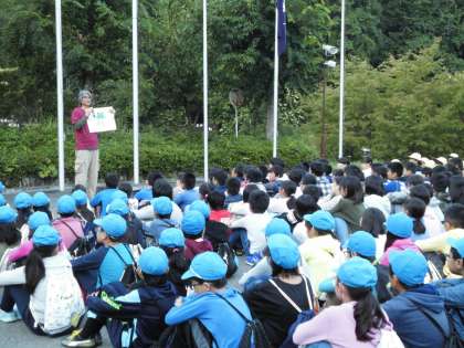 山の家二日目。いっしょに宿泊している山科区の百々小・中京区の朱雀第八小のみんなと朝の集いの時にそれぞれの学校紹介をしました。本校からは3つの自慢を紹介しました。3つの自慢とは、、、。