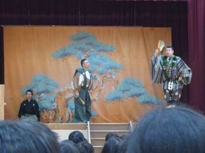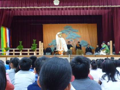 体育館は能舞台に変身し,狂言「柿山伏」と能「羽衣」を鑑賞しました。