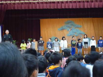 鑑賞した後には狂言ワークショップがあり,代表の子ども達は舞台上で「柿山伏」の一節を演じました。