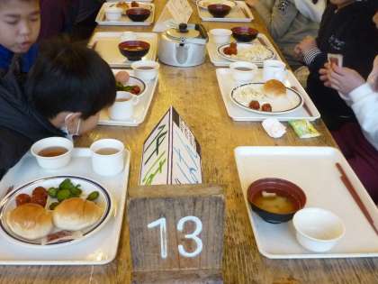 食堂の利用の仕方を再確認しています。しっかり食べて,2日目の活動に備えましょう。朝の主食はパンとごはんが選べます。「明日はちがう方を食べようかな。」と考えながら,おいしくいただきました。