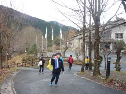 坂道で転んでしまわないように,足元から目が離せません。木をつかんだり,横歩きになったりしながら山の家をめざしました。みんなのペースをみながらゆっくりくだっていきます。天候はすっかり回復してきました。