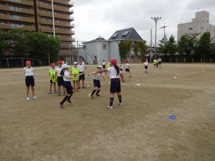 バトンパスの練習をチームで協力して取り組んでいます。