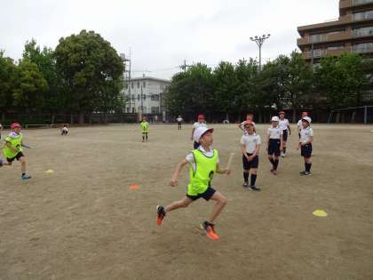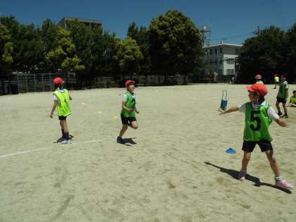 「バトンパスは?」と尋ねると、「右でもらって、左で渡す!」と素早く答える子どもたち、3年生で学習したことをしっかり覚えていました!