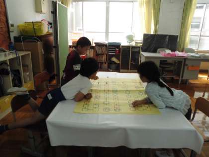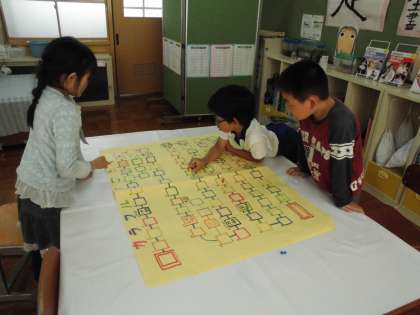 自分たちで考えてできたすごろくを使って,仲良く遊んでいます。全員が早く上がった時は,もう一度ゲームスタートするほどです。