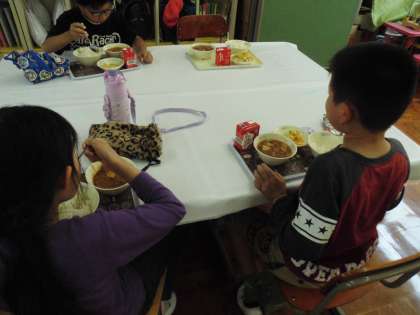 中間休みのころには,給食室からプーンとカレーの香ばしいにおいがしてきます。給食調理員さんがルーから手作りで作ってくれるカレーを子どもたちは大好きです。今日は汗ばむような気候でしたが,カレーのおかげで食欲はばっちりでした。