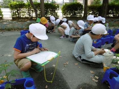 国語科で,観察するポイントを学習した後,大きさや数,形,色,手触り,におい,思ったことなど,細かく丁寧に観察することをめあてに,みんな一生懸命観察カードに書いていました。