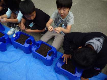 生活科「おおきくなあれ わたしのはな」の学習で,アサガオの種をまきました。