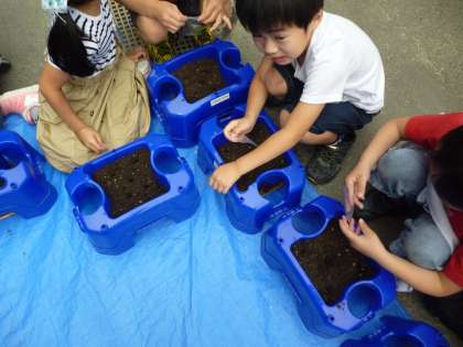 自分達で土にひりょうを混ぜ,ふわふわの土のベッドを作り,種をまき,最初の水やりをしました。