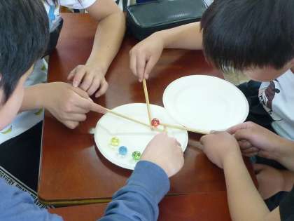 今年度から新たに設置されたクラブもあります。どんな活動ができるのかと,みんなもワクワクしています。理科クラブでは双眼実体顕微鏡をのぞいて岩石を観察しているところでした。チームビルディングクラブでは割り箸を使って,ビー玉をもちあげていました。みんなの心を一つにしないとうまく持ちあがらないようです。