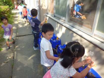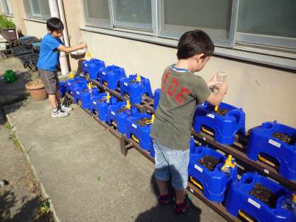 火曜日の学習で種をまいたアサガオの水やりをがんばっています。