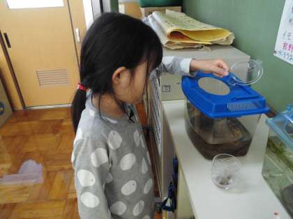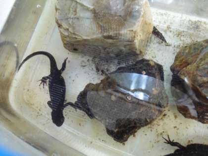 アカハライモリを4匹育てています。初めは校長先生からいただいて育て始めました。少しずつ大きく育っています。