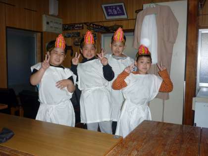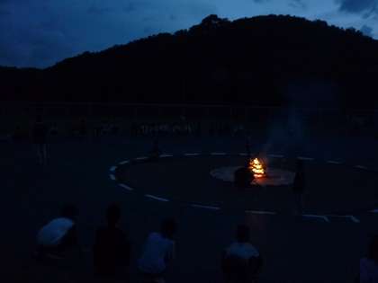 さあ,火の女神と火の子たちが,京都から大切な火をもってやってきました!キャンプファイヤーの火が無事にともるのでしょうか?