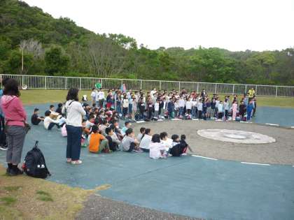 『みさきの家』の2日目の朝です!一緒に泊まっている上賀茂小学校とともに「朝のつどい」をします。どちらの学校も予定時刻よりも10分も前に全員がそろい,スタートすることができました。みさきの家の先生からほめていただきました!5分前行動をいつも心がけています。