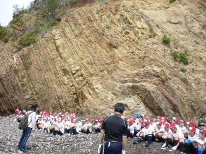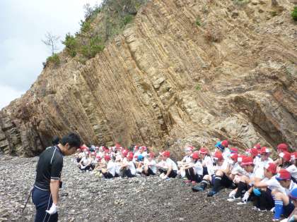 とても立派な地層が見られる場所で,校長先生は興奮気味!でも,みんなの関心は海に集中して,地層には目もくれないようすです。地層については6年生の理科で学習します。そのときまで覚えていてくれるかな〜?