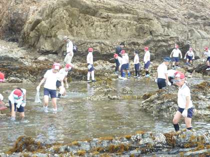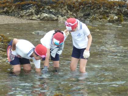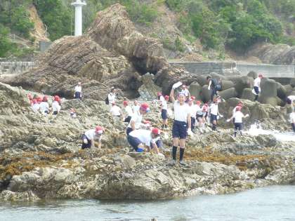 いよいよ海へ!海の水は気持ちいいくらいの温度で,潮の引き加減もいい具合です!岩場の隙間をよ〜く見てみると・・・たくさんの生き物が!みんな感動の声をあげています。