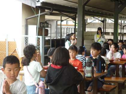 この食事から場所がかわりました。野外炊事場での昼食です。海に続く「深谷水道」のすぐそばで,海を感じながらの食事ができます。おいしい食事がより一層おいしくなるようです!