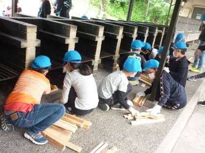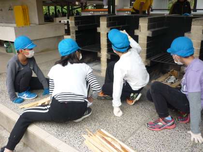 鍋の用意はまだできていないけれど,火の係たちは薪をくんで,いつでも火をつけることができる『かまど』の状態にしています。スタンバイ・オッケー!