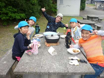 どの班も満足のいくハヤシライスが出来上がったようです。みんな楽しそうに会話をはずませ,ちょっと早めの晩ごはんを楽しんでいます。先生や写真屋さんも班の中に入ってもらって,おいしく食べてもらいました。