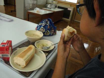 今日の給食は,「ツナサンド」。ツナサラダにマヨネーズを和え,パンにはさんで食べました。美味しいサンドイッチができました。