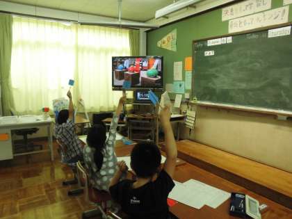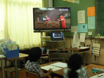 パワーアップタイムの中で,NHKの番組を視聴し,正しい発音を選ぶ学習をしています。今日の発音は「SHORT」。似ている3つの発音の中から正しい発音を選んで答えます。