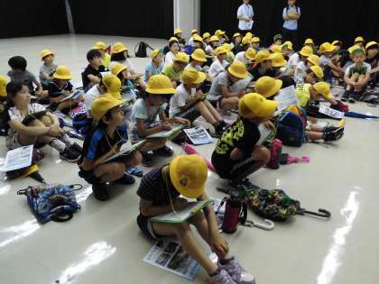着くまでに足元がずぶぬれになってしまいましたが、センターの人のお話が始まると、しっかりとメモを取って頑張っていました!