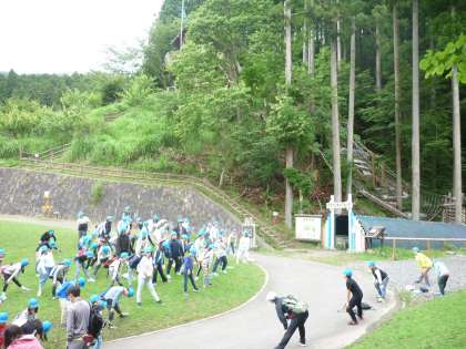 太陽は顔を出してくれないけれど,雨は降っていないので,アスレチックを思いっきり楽しめそうです!まずは準備体操から。