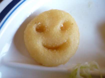 野外炊事で作った絶品カレーライスを5時に食べたので,おなかがペコペコです!キュートなポテトフライが並びました!水筒のお茶はこのようにずらっと並べて先生やボランティアの先生が入れていきます。