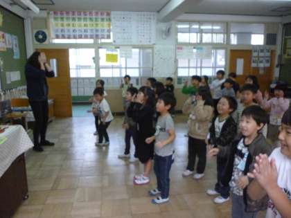 これまでに学習した,体の調子の言い方を使って"Hello song"を歌ったり,"Brown bear, brown bear, what do you see?"を読んでもらったりしました。