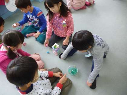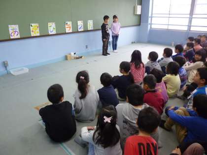 2年生が学習で作った手作りのおもちゃを1年生に紹介しようと,おもちゃランドに招待してくれました。