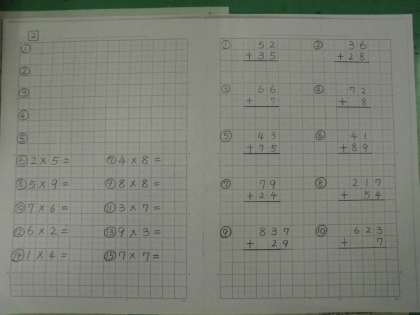 1まい目(左)の写真は,先生がじっさいに「くりかえし計算ドリル」の2番と3番をノートに書いてみました。