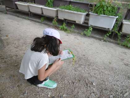 この間の「動物のすみか」の学習の続きで,見つけた動物(昆虫)がどんな場所で何をしているかを観察しました。