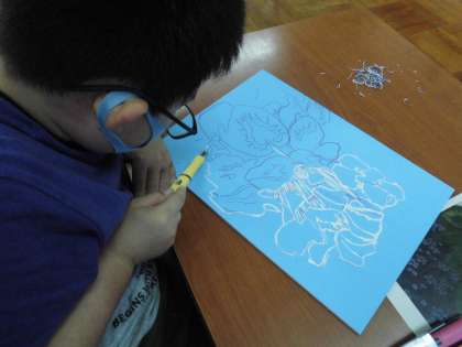 今年度は,一版多色刷りの版画に挑戦します。前回までで下描きを終え,いよいよ彫刻刀で線を彫っていきます。彫刻刀を初めて使うので,安全に気をつけてゆっくりと彫り進めることにしました。彫刻刀を右手に持ち,その時に絶対に左手は後ろに位置するように注意しました。