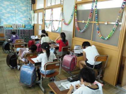 入口でファイルをもち,挨拶をしてまなびに向かう子どもたち。スタッフの先生方にはいつも行き届いた学習環境を設定していただいているので,放課後にもかかわらず子どもたちは一生懸命学習しています。楽しみにしていたのに,行事の関係でお休みになることもありますが,年度末までしっかり励んでほしいと思います。