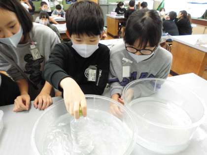「押してないのになんでかな?」,「温度が関係してるのかな?」,「空気の体積が小さくなったのかも。」と,その後は,気が付いたことをグループで話し合いました。