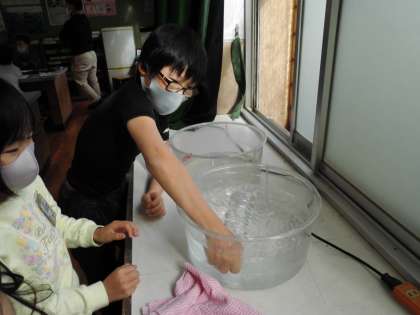 空のペットボトルをお湯や氷水につけて,様子を比べてみました。