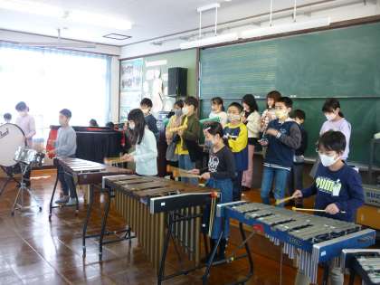 木琴や鉄琴,打楽器などパート毎に分かれてみんなで演奏に励んでいます。全体で合わせた時は,きれいな音色が響き渡るようになりました。