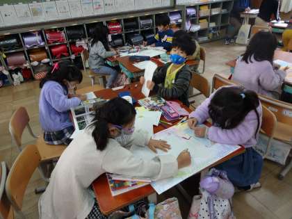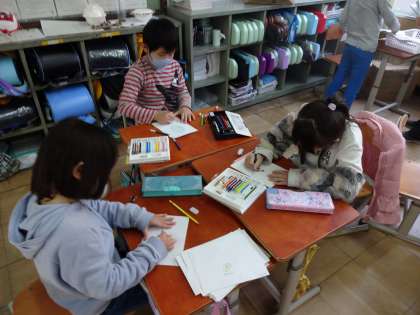 国語の「ものの名まえ」の学習で,魚や野菜などのまとめてつけた名前と,鮭や鯛,きゅうりやトマトなどの一つ一つの名前があることを知りました。まとめてつけた名前や一つ一つの名前を集めたり分けたりしたことを生かして,学習の最後に「お店屋さんごっこ」をしました。それぞれが好きなお店屋さんを決めて,商品や看板作りに取り組みました。どの子も熱心にお店屋さんの準備をしていました。