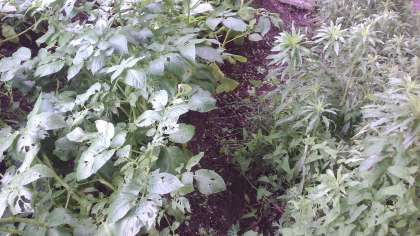 いよいよ,育てたジャガイモの葉を使って光合成の実験です。日光があると葉ではどのような反応が起こるのかを実験します。ですが,まさかの梅雨入りです。写真でもわかるように日のあたる方に葉が茂っていますが,雨では日の光も届きません。葉が日光をたっぷり浴びられるよう,晴れることを祈っています。