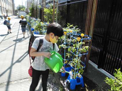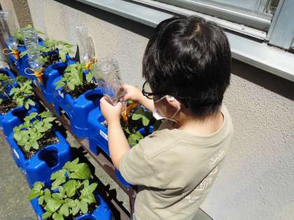 1年生は朝顔を育て,2年生はミニトマトを育てています。先週は雨の日も多く,植物にとっては恵みの雨でした。今日はとてもいい天気。お水を多めにあげました。