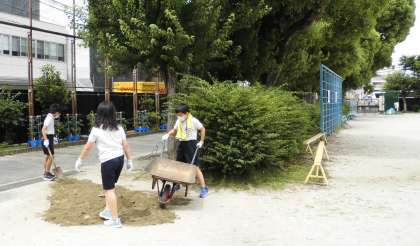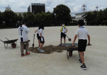 掃除時間に,運動場の水たまりができる場所を土で均しました。
