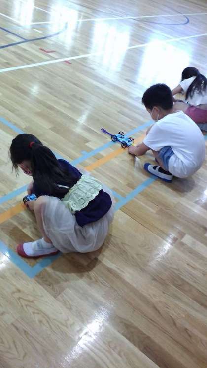 理科の学習では,ゴムで動く車を作って遊びました。