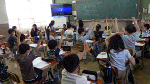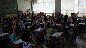 その後,音源を聞きながら,二重唱のよさを感じ取るとともに,高低の変化をパパゲーナとパパゲーノに分かれて手を上げて,表現しました。