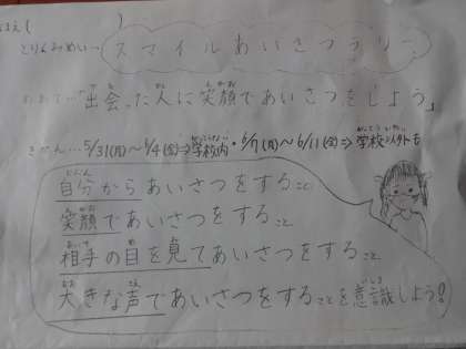 自分から笑顔であいさつができるように先週から始まった「スマイルあいさつラリー」。