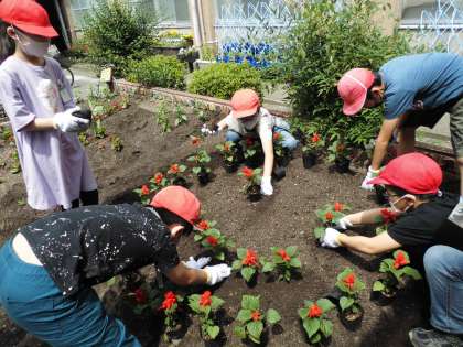 環境委員会の5・6年生が中庭の花壇に花の苗を植えました。