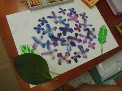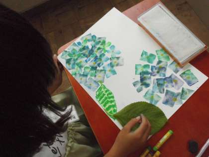 あじさいの葉っぱは実物を隣に置いて,よく見て描きました。