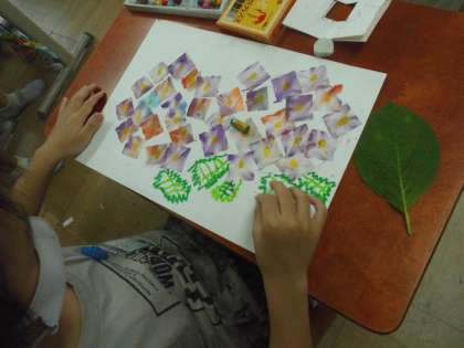 お花ができたら,今度は葉っぱやかえる,かたつむりなどをまわりに描きました。