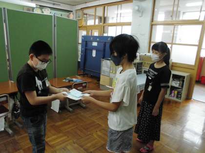 校内クイズラリーで正解した児童に「しおり」が贈られることになり,図書委員さんが4組教室に持ってきてくれました。6年生の児童が代表で受け取りました。図書委員さんの素敵な取り組みでした。