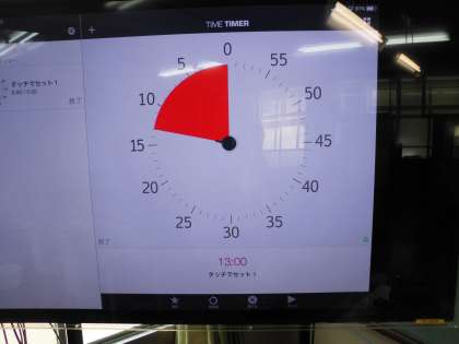 子どもたちはタブレットを使って学習することを大変喜びます。ただ,終わることができずに,指導者が強く注意してしまうことも・・。そんな時には,タイムタイマーを使うことが有効です。時間の経過を視覚的にとらえられます。また,終了時に「ピッ。ピッ。」という音を鳴らすことでさらに終わりを意識できます。